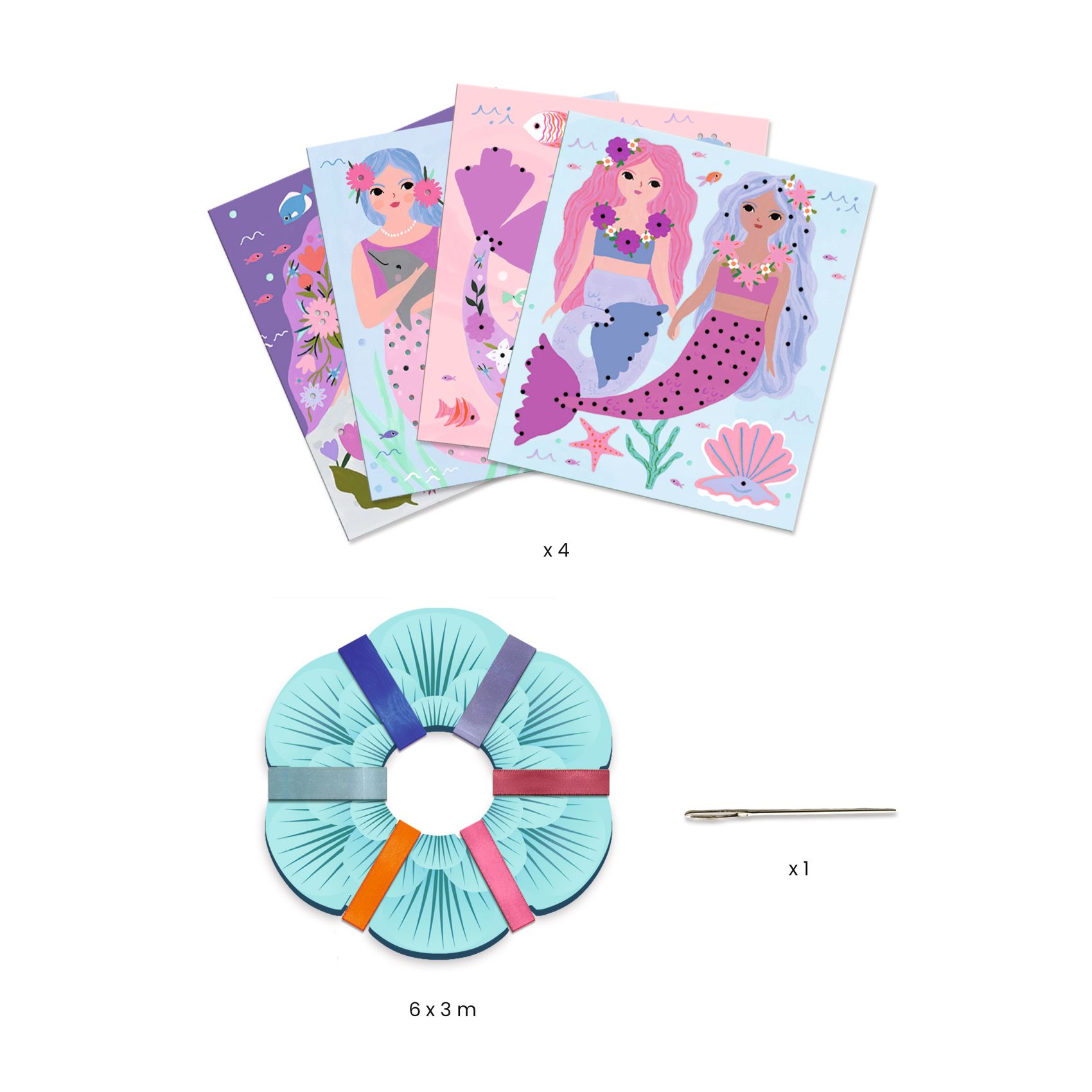 Kreativní sada se saténovými a organzovými stuhami.Děti pomocí jehly s tupým hrotem provléknou stuhu předděrovanými kartičkami a poté z nich vytvoří zákruty, smyčky a malé uzlíky, aby obrázky získaly tvar a leskly se.
